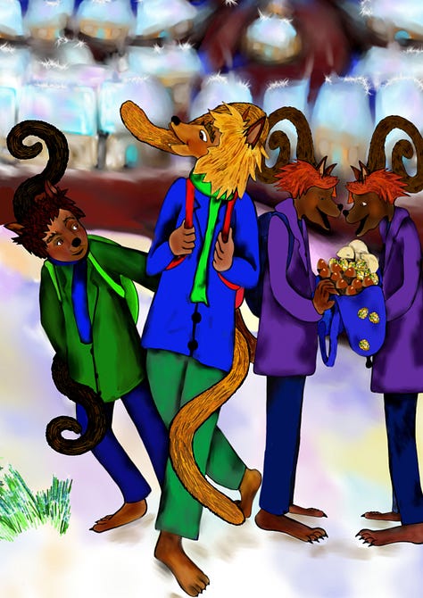We go to the magical, musical ice tree. At the party will be wonderful music. The tree is ready! The icicles are lovely!